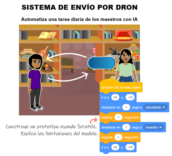 Los estudiantes crean su primer prototipo de dron impulsado por IA para resolver un problema escolar. Usando Scratch, programan un objeto dron para recolectar objetos y regresarlo a su punto de partida. Los estudiantes mejoran la vida de su maestro usando las lecciones de IA encontrando maneras de mejorar el sistema para diferentes ubicaciones y movimientos del objeto.